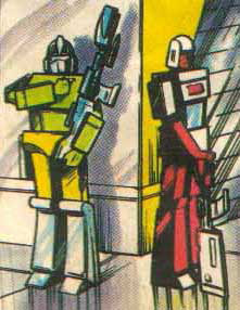 These two generic Transformers were guards, standing in the background at Autobase when Emirate Xaaron and Impactor came in, trailing mud. While one of these Autobots seemed to be doing some kind of salute, as senior officers pass by, the other is just standing there with his hands on his gun.