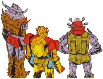 The two outside Junkions in this set are fairly standard Junkion fare, but the central guy is actually rather unique. He appears to be a design completely invented by the artist, from his head down onwards to his feet. Notice that, apart from his horned head, he lacks the spikes common to other Junkions. Notice, also, that he lacks the 'Motorcycle Head' of most Junkions.