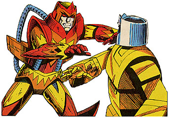 Over All: Well what can I say? Flame was just fun. Most ranting, mad-scientist types are fun, after all. He was the first (and one of the only, I'd say) genuinely evil Autobot. But... if there is one complaint I have about Flame it's that there's no ambiguity. This guy is a lunatic. There's no suggestion of any possibility that his plan might have merit, let alone it's execution. If Furman's script didn't brand him as a lunatic, Jeff Anderson's wildly gesticulating madman erased all doubt. When Robin Smith was given the artist's duties on Flame he took it even further, making him a grinning, maniacal super-villain. Not that there's anything wrong with that, as such, but it's always nice to be given some ambiguity about 'rogue good guys' in these sorts of stories.