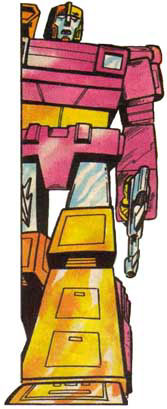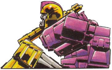 He definitely looks cool, and might have made an okay toy if they'd just make one of him. Since we know his alt mode is a drill tank, it's easy to speculate how he might have transformed. His head folds down, and his shoulder-canon moves over to become a tank-turret. Then his arms fold under his front, whatever weapons or hands are in his wrist sockets are removed and replaced by drills. After that his body, from about the stomach area down, folds backwards, forming the rear of the tank. Finally tank treads pop out of somewhere, probably his legs and forearms. At least that's the way I see it.