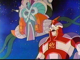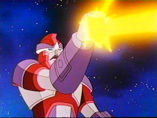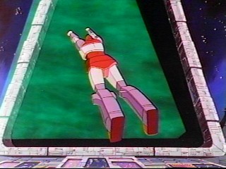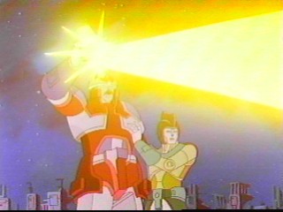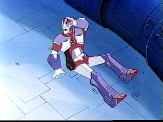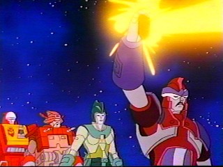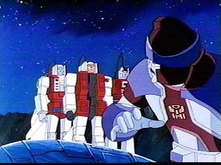 The valiant Optimus Prime, of course, hooked himself up to Elita and let his energy flow forth. (This was pretty close to being a graphic sex-scene, Prime hooking his crotch to Elita's, then grunting and as energy flowed into her. Surprising they got away with it in a kid's cartoon.) Elita One's safety assured, Alpha Trion sent the two silly kids on their way, to save the Female Autobots, and send the Decepticons packing back to Earth.