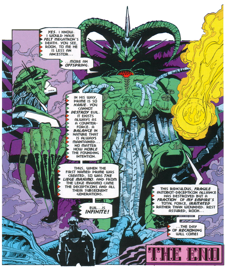 The Liege Maximo was the ultimate evil. The counterpoint to the "Prime" line. The "father" of the original Decepticons and the Cybertronian Decepticons. And he was also HUGE! He seemed like an attempt to create an 'ultimate evil' to replace and surpass Unicron. I suspect, had the book continued, he would have done just that!